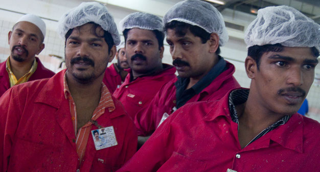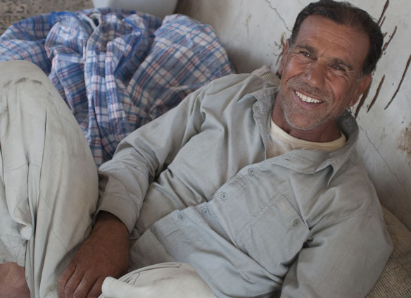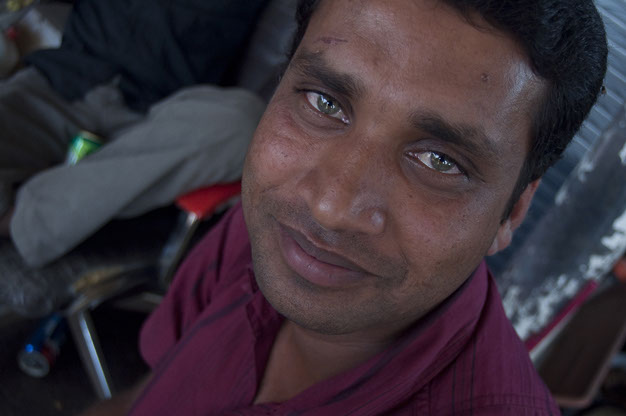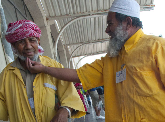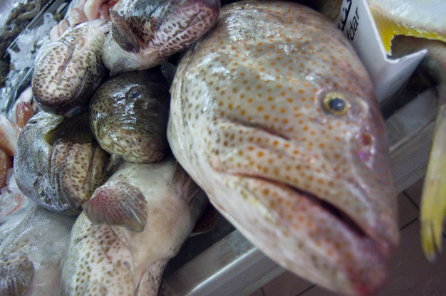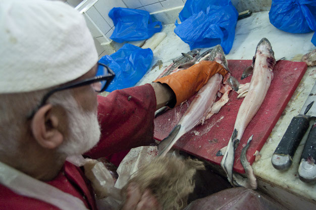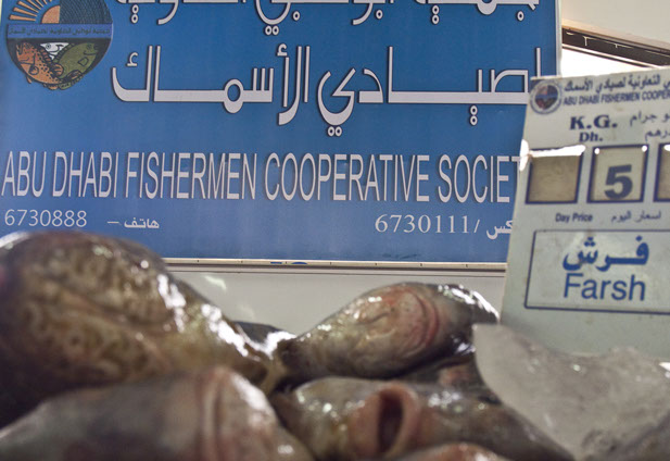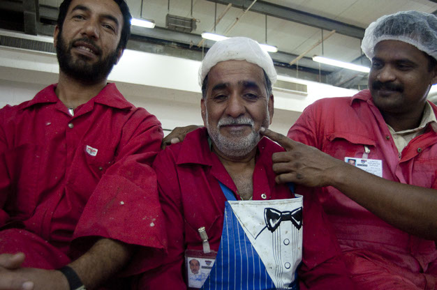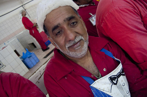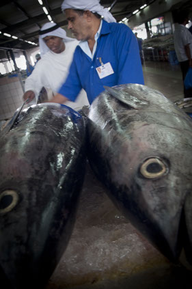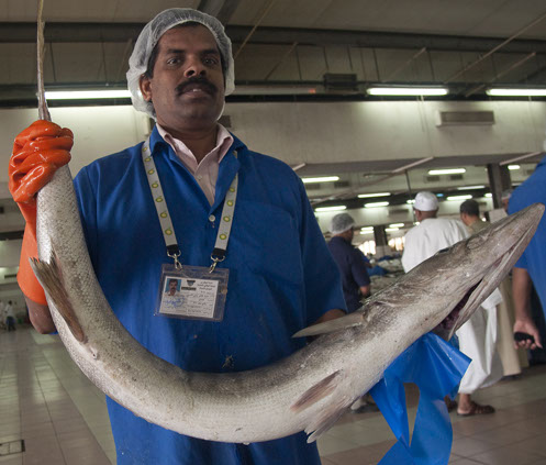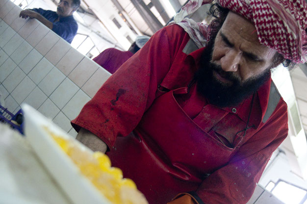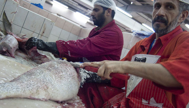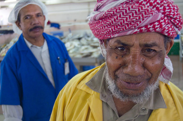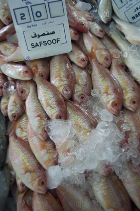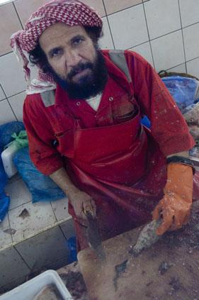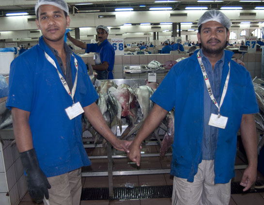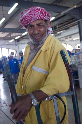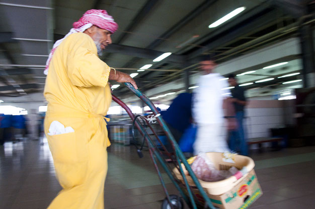 The Fish Market opens early as fish start arriving from the adjacent Dhow Harbor. The fish vendors unload the fish and prepare their displays on top of crushed ice. The Market is broken down in colors. The blue jackets sell the fish, the men in the red are cleaning the fish and the yellow guys are porters. A diverse range of faces shows up here, Iranian, Egyptian, and Jordanian men work with the Pakistani’s and Indians.