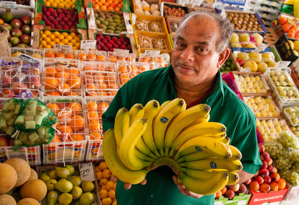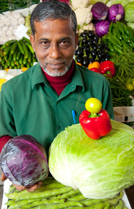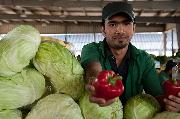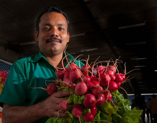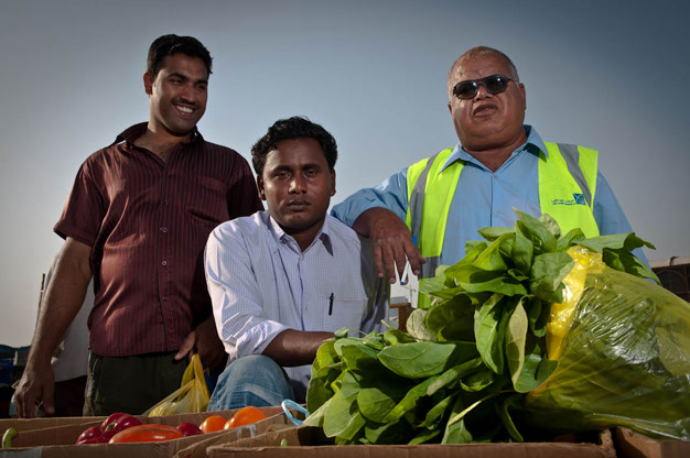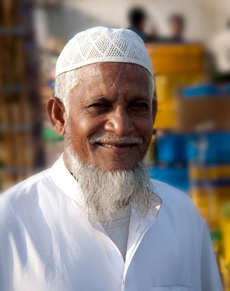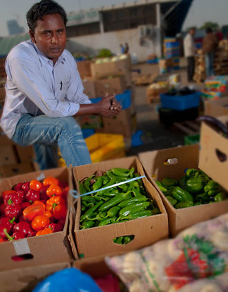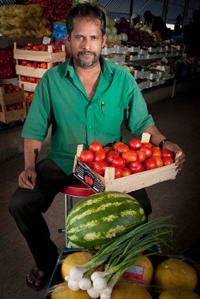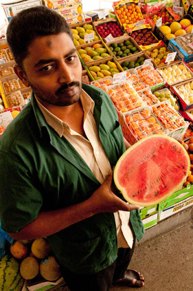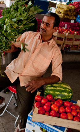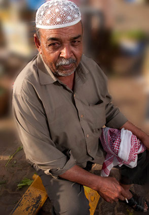 I discovered the Abu Dhabi Fruit and Vegetable Market one day and started shooting inside. The wholesale area covered a couple of blocks where the trailers came in and out, but one area was covered and operated on a retail basis. It was open air, building with a sliver of light coming into the space underneath the blue striped awnings. Shooting inside with available light was difficult, so I returned many times each time with more and more lighting equipment until on my last trip, I set up a full studio in a shaded part of the market.